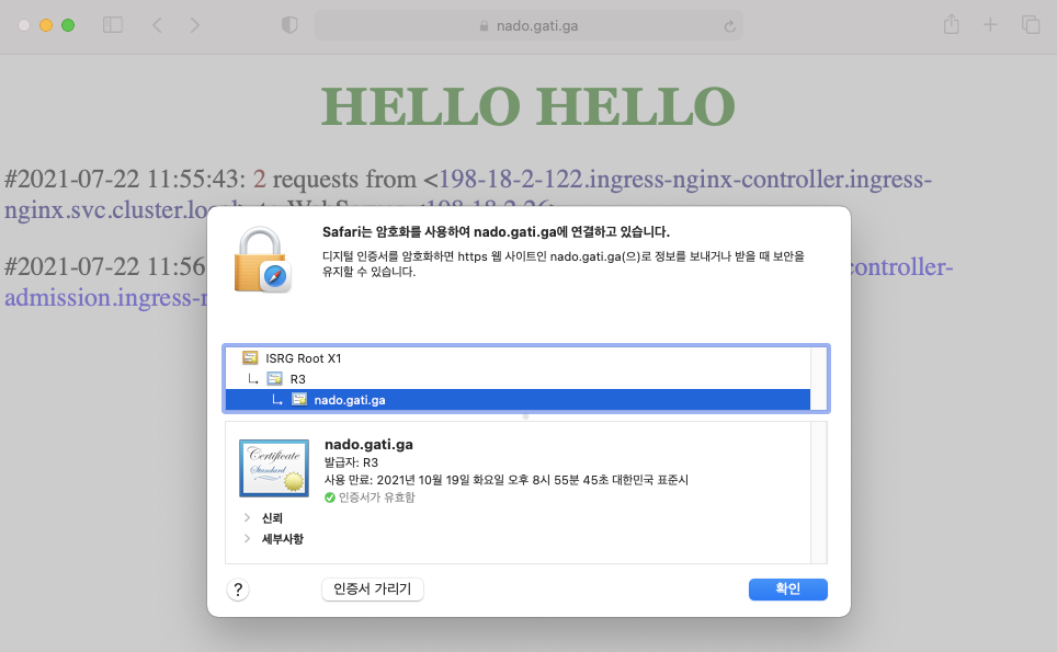 nado.gati.ga 접속 시 인증서 설정이 정상적으로 되어 https 로 연결되었음을 확인할 수 있다.