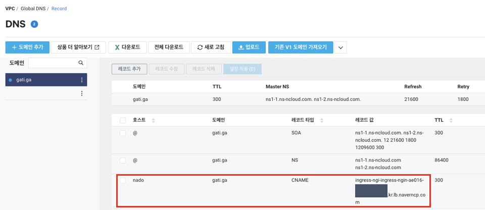 webweb-ingress.yaml 에서 인증서를 발급할 도메인으로 설정한 nado.gati.ga 에 ingress-nbl 도메인을 설정해준다.